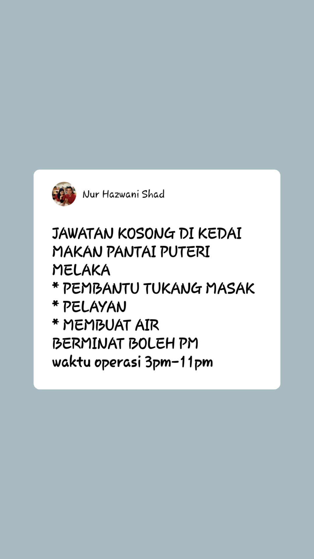 Nurul Ain On Twitter Jawatan Kosong Di Kedai Makan Pantai Puteri Melaka Pembantu Tukang Masak Pelayan Membuat Air Berminat Boleh Pm Waktu Operasi 3pm 11pm Https T Co Baygsrryfp Twitter